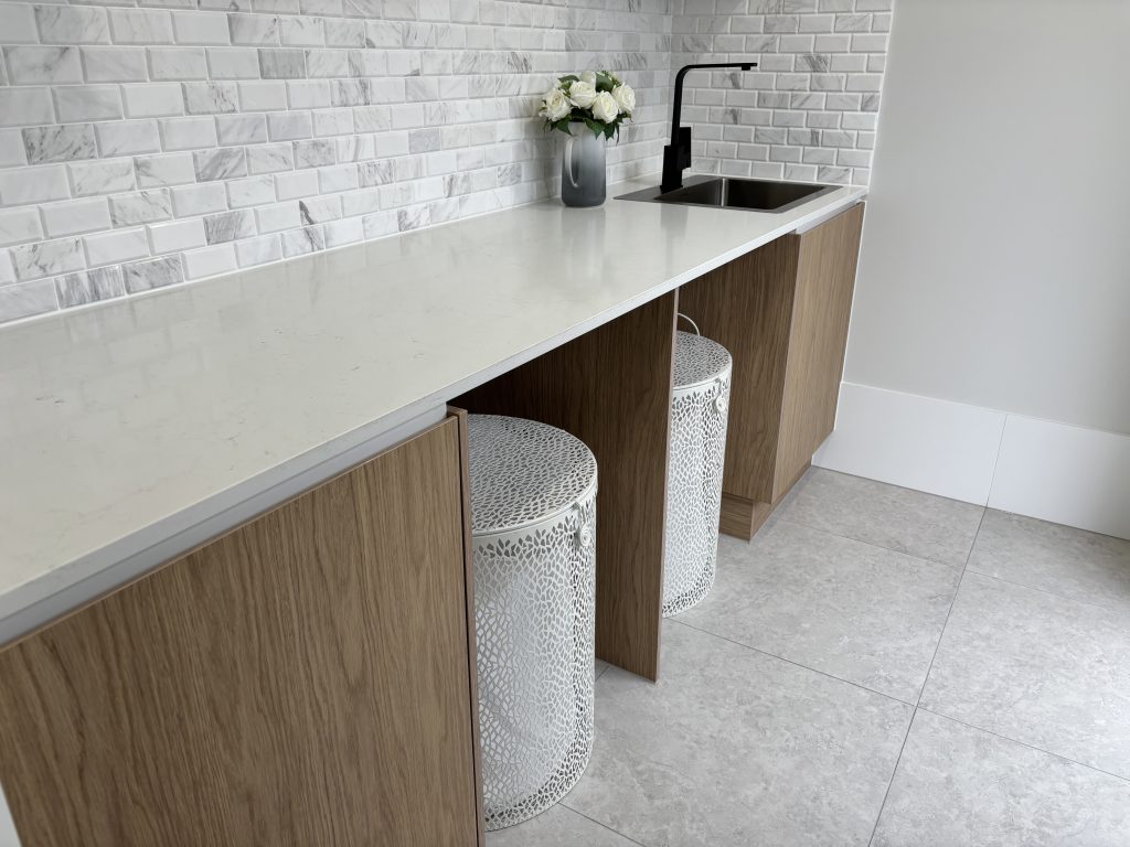 - Clean inside, outside, and around the laundry tub, cabinets, shelves, drawers, and tapware.